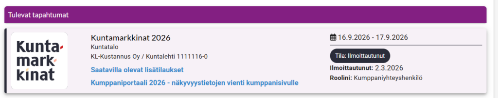 Kirjautumisen jälkeen pääset sivulle, jossa valittavana on mm. Saatavilla olevat lisätilaukset sekä Kumppaniportaali 2026 – näkyvyystietojen vienti kumppanisivulle. Valitse kumppaniportaali klikkaamalla sen nimeä. Kumppaniportaalin tietoja voi täyttää heti sen avauduttua ja täydentää tietoja tapahtumaan saakka.